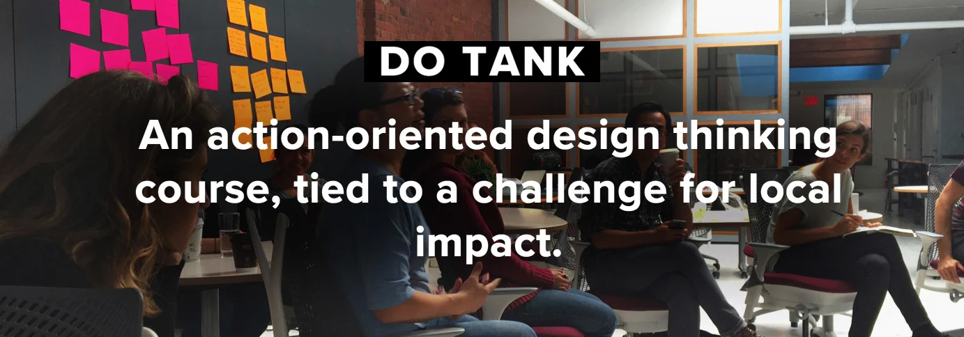 The Do Tank is an action-oriented design thinking course, tied to a challenge to translate learnings into local impact. The Do Tank cultivates a group of people with varied skillsets to work together on a real-world issue, from collaborative ideation to collaborative creation.
