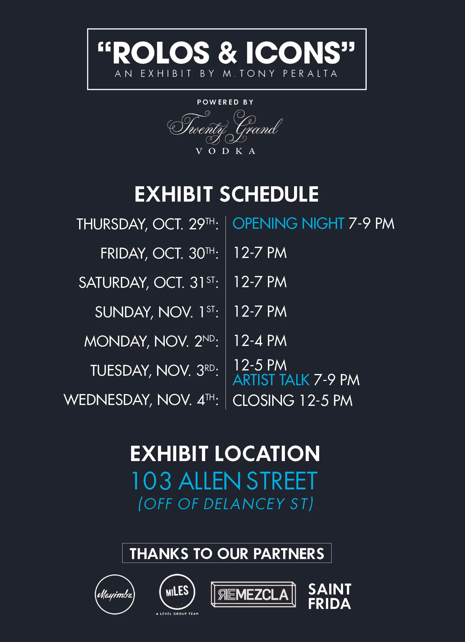 You are cordially invited to a preview of the new works of contemporary artist M. Tony Peralta’s “Rolos & Icons” on display Thursday, October 29th through Wednesday, November 4th at 103 Allen Street in the Lower East Side. Rolos & Icons is a collection of screen-printed paintings of powerful and iconic Latin women throughout history – donning the hair rollers, or rolos in Spanish. The series is inspired by a piece M. Tony Peralta created in 2010 entitled,“Doña Con Rolos.” The series demonstrates Latina legends such as Frida Kahlo, Lynda Carter and even Dora the Explorer, with their hair styled in rollers, ready to go under a hair dryer. Peralta hopes these images will make these figures more relatable, and provide young women of color an opportunity to see themselves in these women.